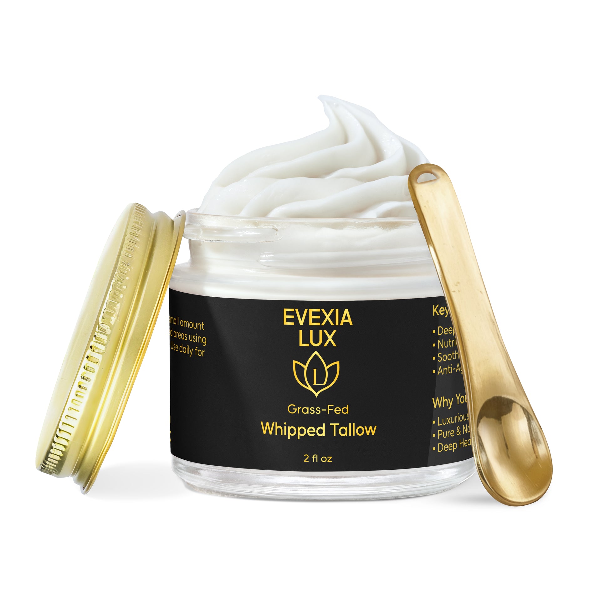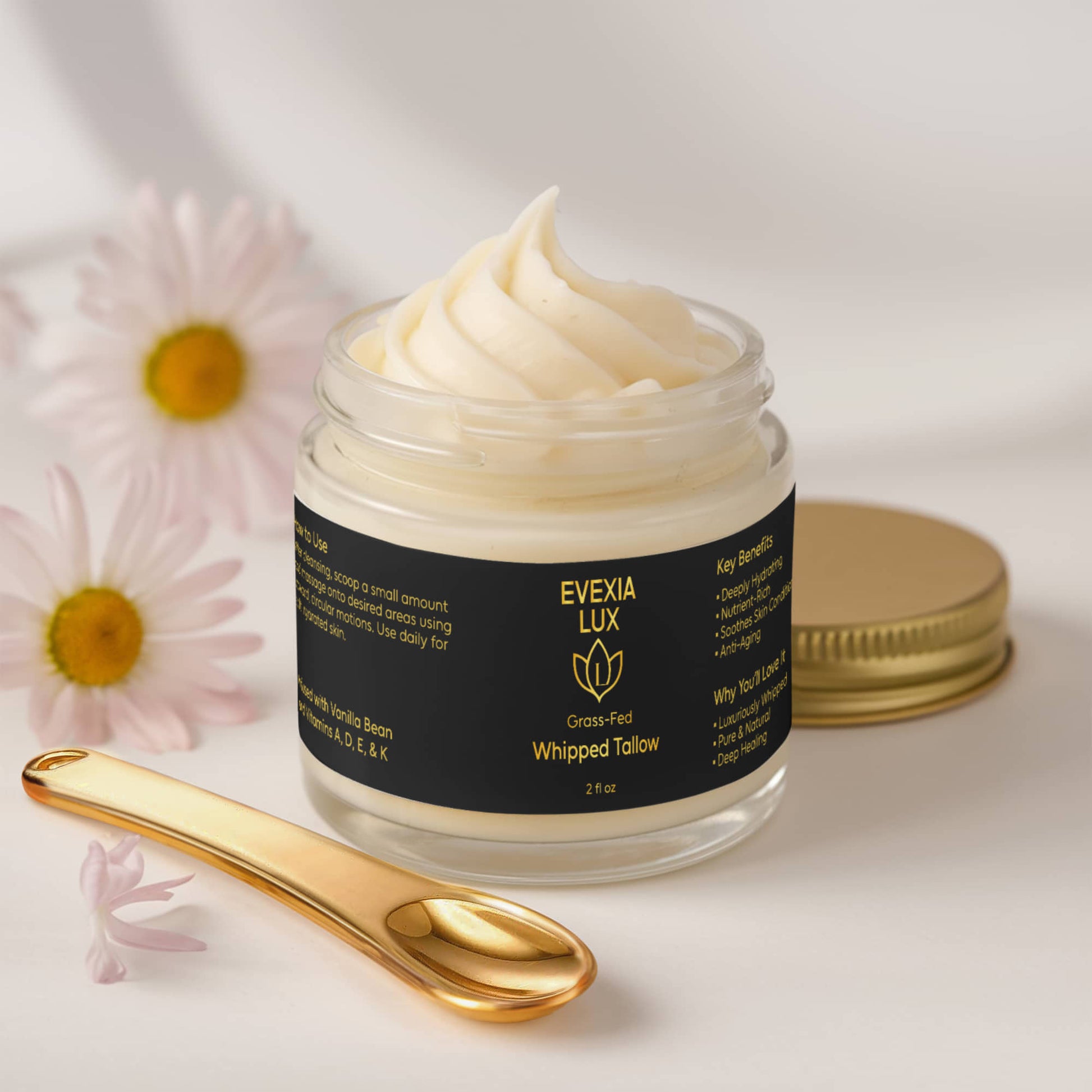 Grass-Fed Tallow – Rendered from the fat of grass-fed beef, this animal fat is rich in skin-compatible fatty acids and vitamins A, D, E, and K, deeply nourishing and repairing the skin.
